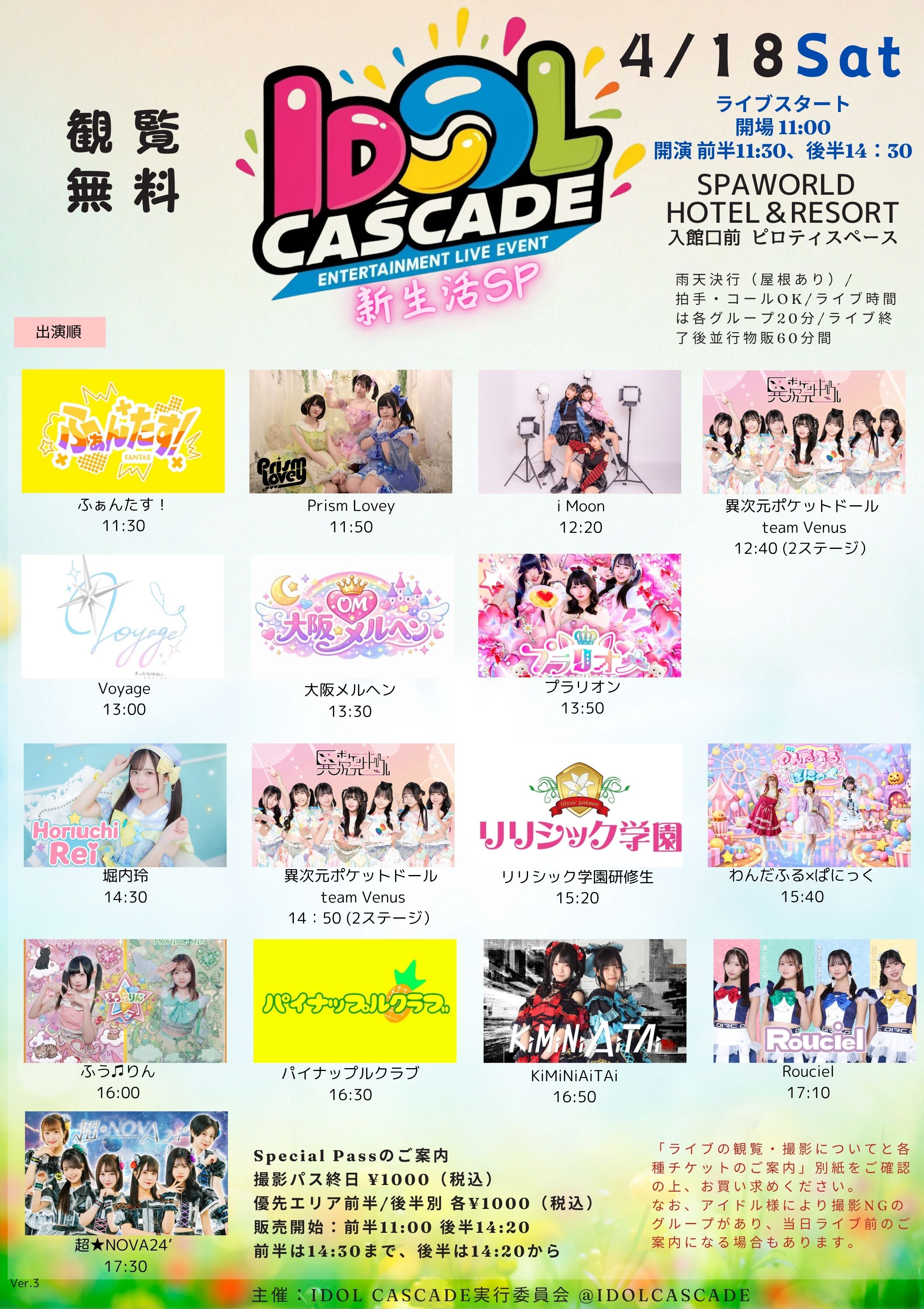 出演:i Moon / 異次元ポケットドール team Venus / 大阪メルヘン / KiMiNiAiTAi / 超★NOVA24’ / パイナップルクラブ / ふぁんたす! / Prism Lovey / プラリオン / Voyage / 堀内玲 / リリシック学園研修生 / Rouciel / わんだふる×ぱにっく