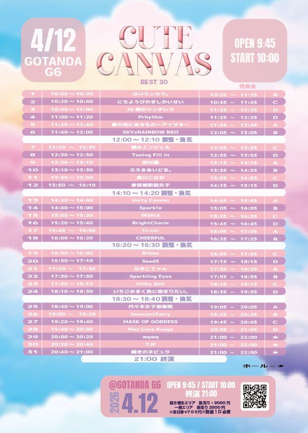 出演:SKY×RAINBOW NEO / はいうぃろう。 / にちようびのきしかいせい / 26時のシンデレラ / Prhythm / 愛の先にあるもの~アイサキ~ / 病みエンジェル / Tuning Fill in / 岩村華 / ふえるあいどる。 / 桃川こはね / 参宮橋駅前女子 / Unity Canvas / BrightCharm / Ci-nic / CHEERFUL / Blüme / SeedS / なゆこてゃん / Sparkling Eyes / Milky Doll / いちごみるく色に染まりたい。 / 代々木女子音楽院 / InnocentFairy / MASK OF GODDESS / May Love Rouge / wqwq / TJP / 瞬きのネビュラ / Spark!e / INSRiA